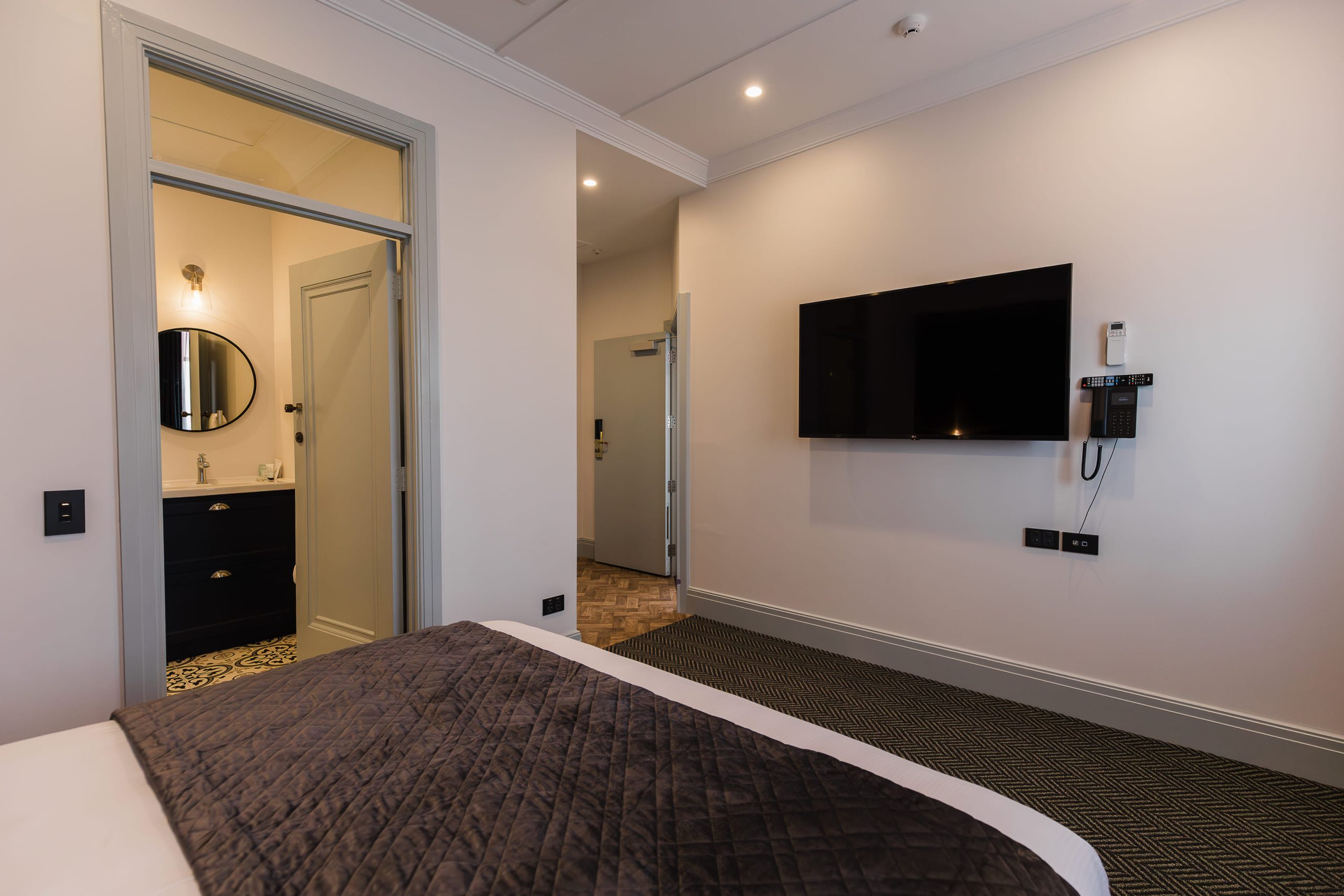 The Deluxe Suite embodies refined comfort with carefully curated furnishings, soft lighting, and contemporary amenities to ensure a restful stay. The interiors blend period-inspired detailing with modern functionality, creating a calm and stylish retreat within our beautifully restored heritage building.